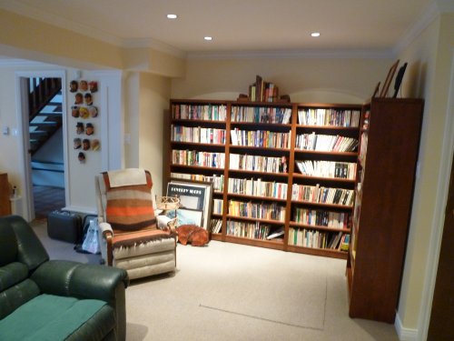 | The back half of the study. When the new 3D TV's come in, the Flat screen from upstairs will come down here and we will buy one of those electric fireplaces to fit under the picture. | Our little Library.  |