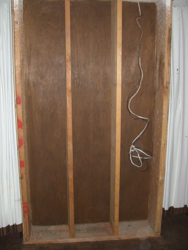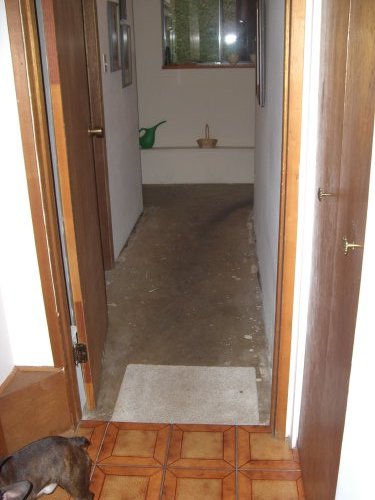 | Looking down the corridor towards the washer/dryer and bathroom door. | The famous support wall that kept the support beams straight. |