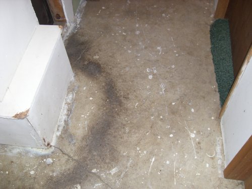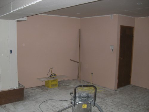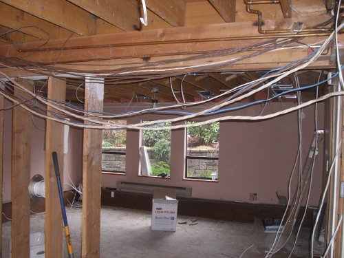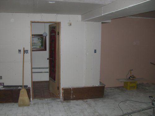 | The existing parquet floor had to come up as it was lifting and breaking in too many places to bother to fix it. This picture is looking forward. | No, that is not Marley's ghost --- it is one of the most important things in the house ... my beer fridge. This picture is taken from the same spot as the last one 'cept that it is looking to the rear. |
