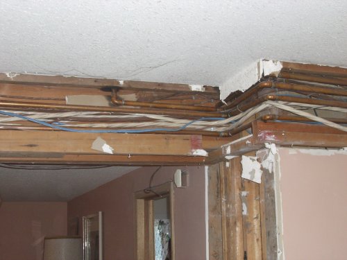 | The hot water heating, electric and god knows what else ran through that beam. | Moving the electric and hot water connections so the steel beam could be inserted then we could remove the 4 2x6's and enlarge the room. |