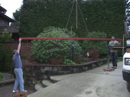 | Somehow, they were to get this monster up into the ceiling and on top of the new vertical supports built into the wall. | I guess they knew what they were doing because it was up and glued and screwed every 12 inches into place. |