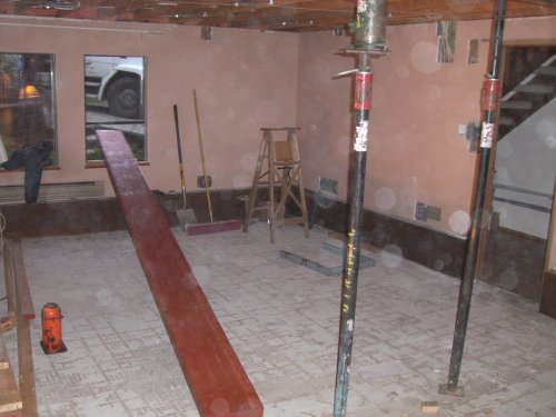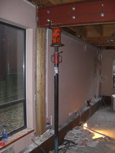 | Vertical supports in the wall to support this massive beam. Final jacking being done. | Of course, Elsie fled upstairs where it was much more quiet.  |