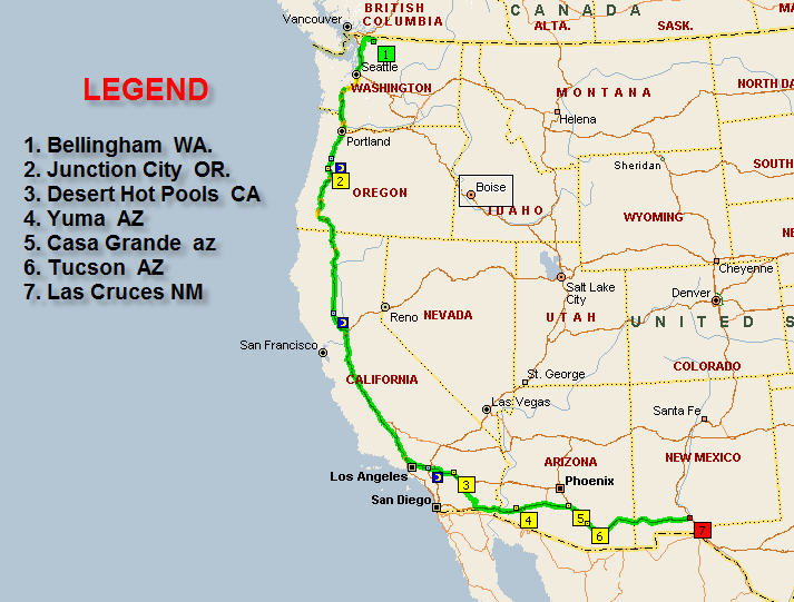 Off he heads boat and trailer hooked up, and knowing that we are in Tucson, he stops by to say "hello" and pour over maps to choose a route that is the flattest possible for his return home. We help him select the best of the bad alternatives, have dinner, and wave him goodbye ..... not sure if the next time we see him he will be in a ditch at the bottom of the longest downhill section of the Siskiyous Pass in Oregon. Four days later, lo and behold, we have an email from him stating that he made it home in tip top shape. This folks, is nothing less than a miracle ... of course, he claims that it is superior driving skills and knowledge that allowed him to complete this marathon.